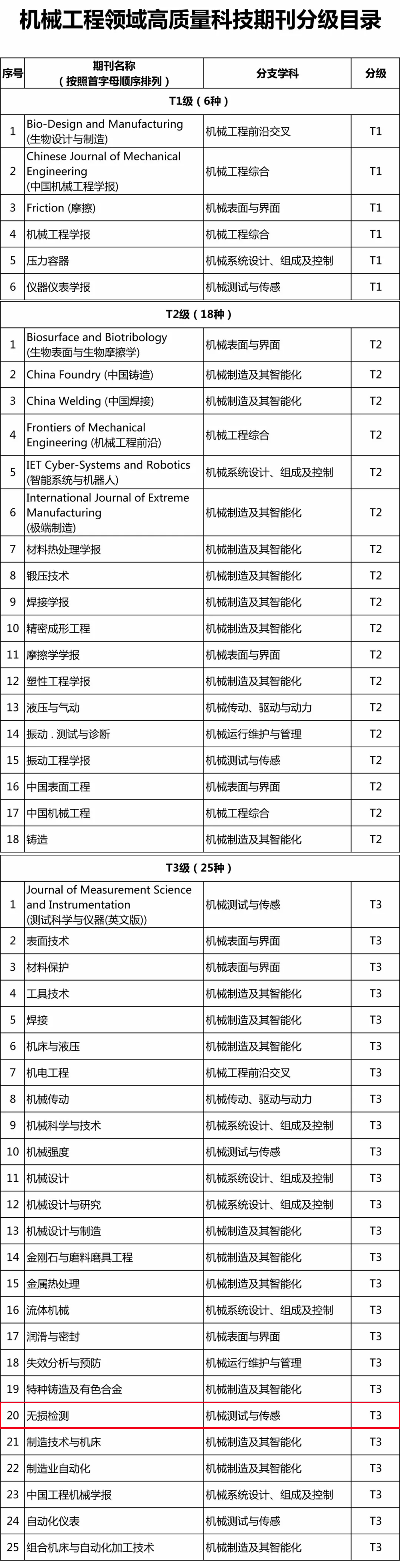 经过前期调研、专家初评和审定委员会终审等多个环节,最终形成了包含我国机械工程领域49种期刊的《机械工程领域高质量科技期刊分级目录》。该目录分为3级。其中,T1级6种,表示已经具备或接近国际一流期刊水平;T2级18种,表示达到国内外知名期刊水平;T3级25种,表示业内认可的较高水平期刊。